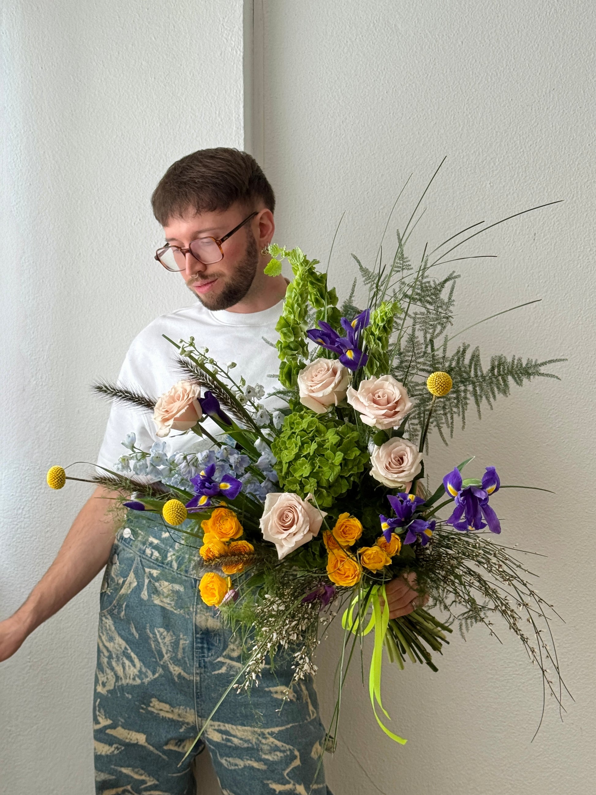 This stunning floral arrangement, the ÍRIS BLEND (M), showcases the vibrant beauty of wild iris and eye-catching delphium. Elevate any space with this expertly crafted bouquet that will surely brighten up your day.