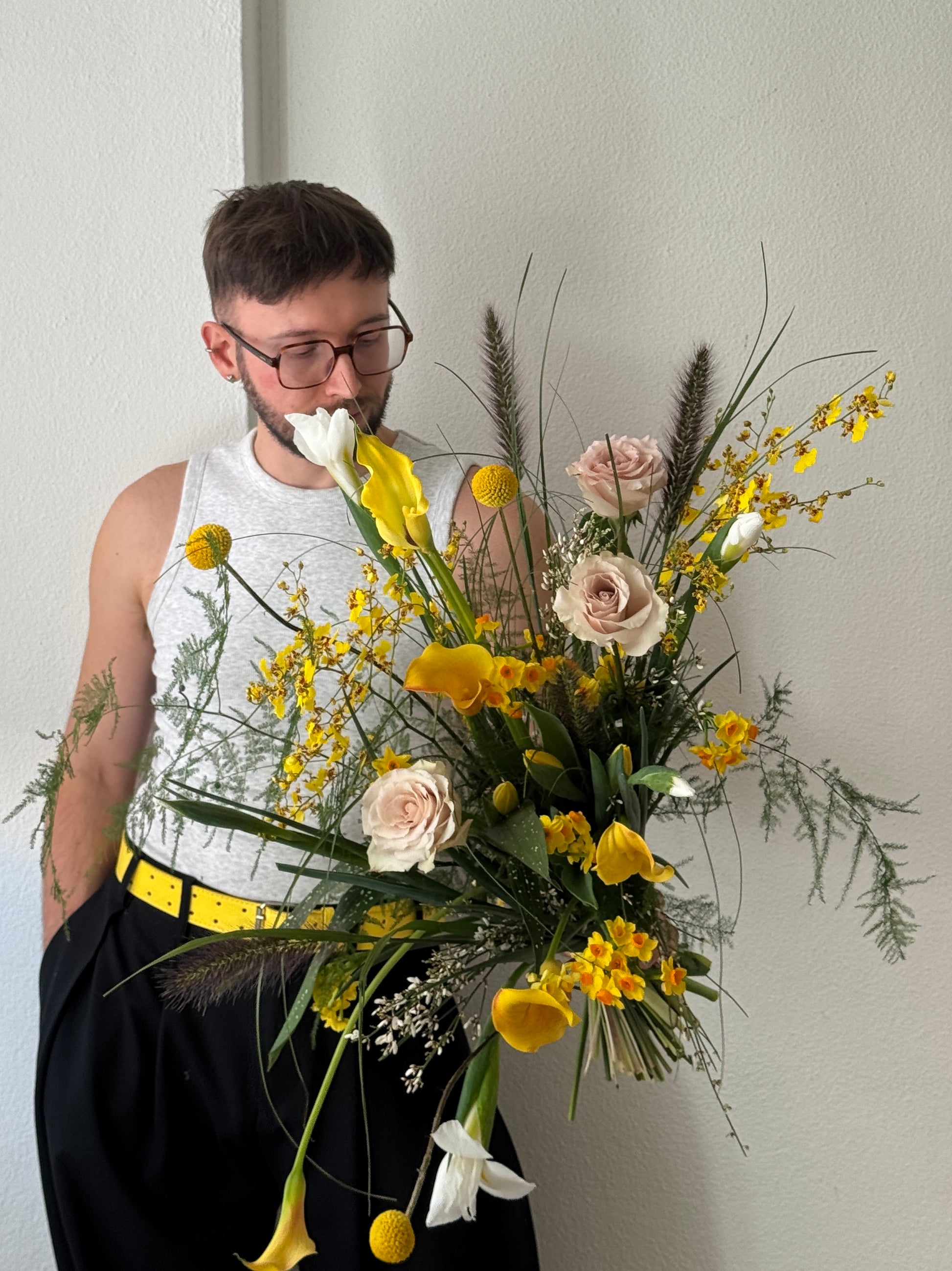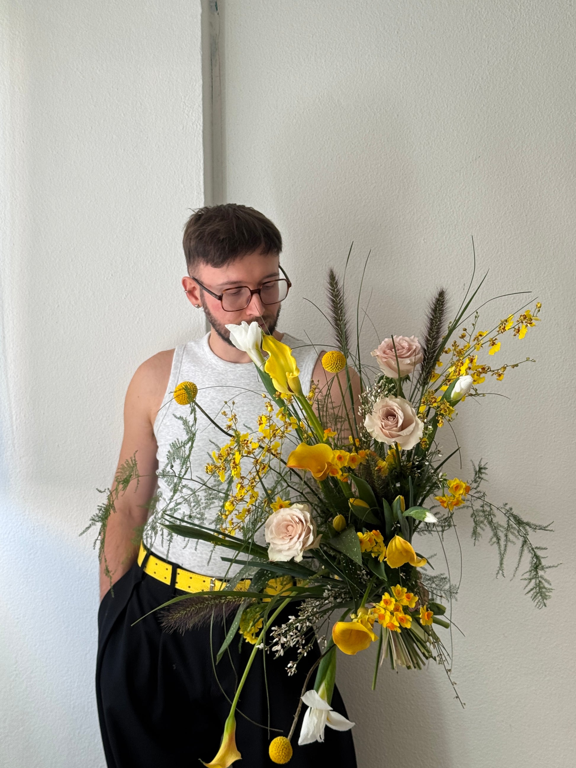This YELLOW BLEND (M) is a stunning mix of spring flowers including tulips and daffodils. Enjoy the colorful display and refreshing scents, perfect for brightening any space. With a variety of blooms, this blend brings a touch of nature indoors.
