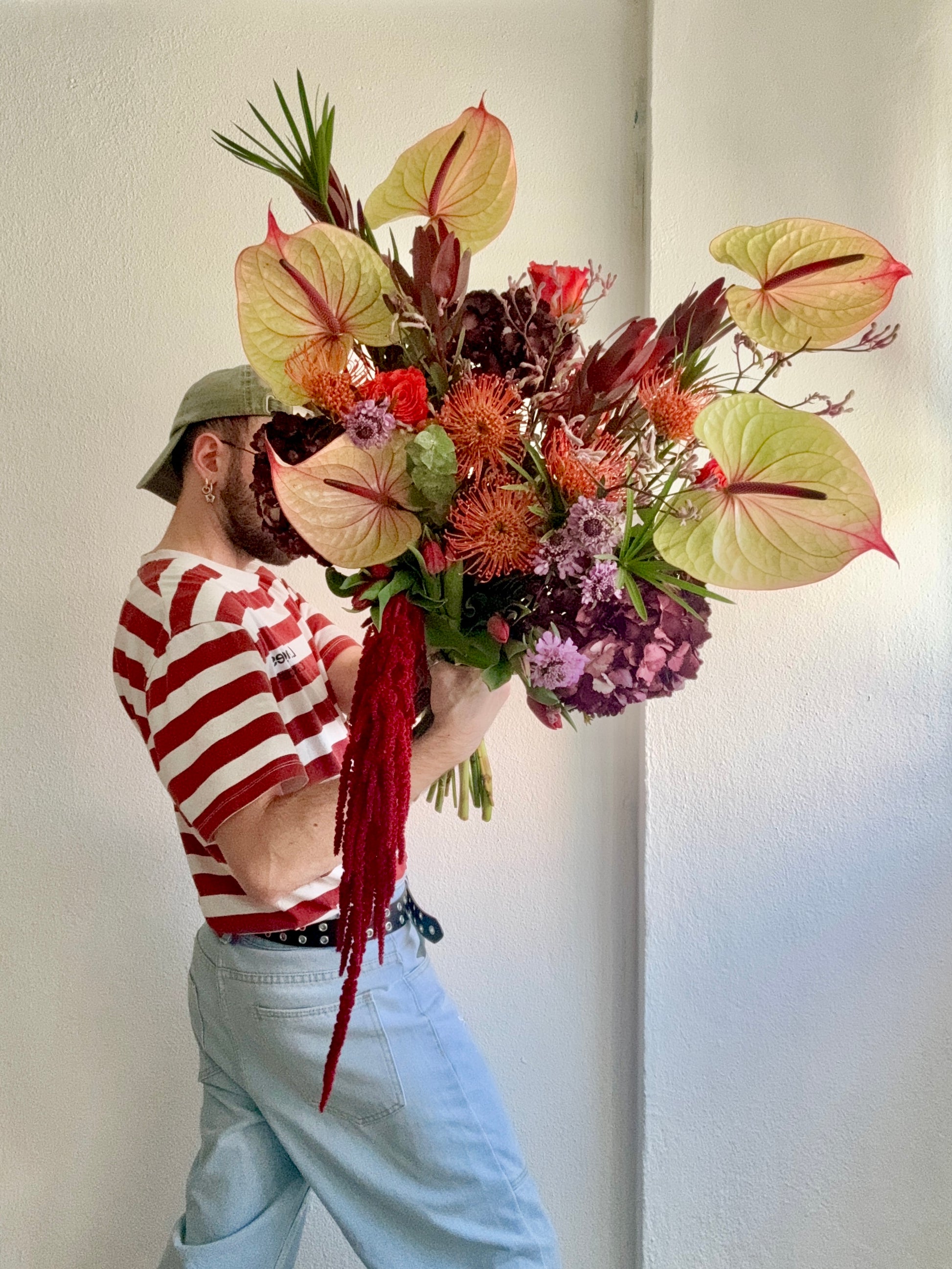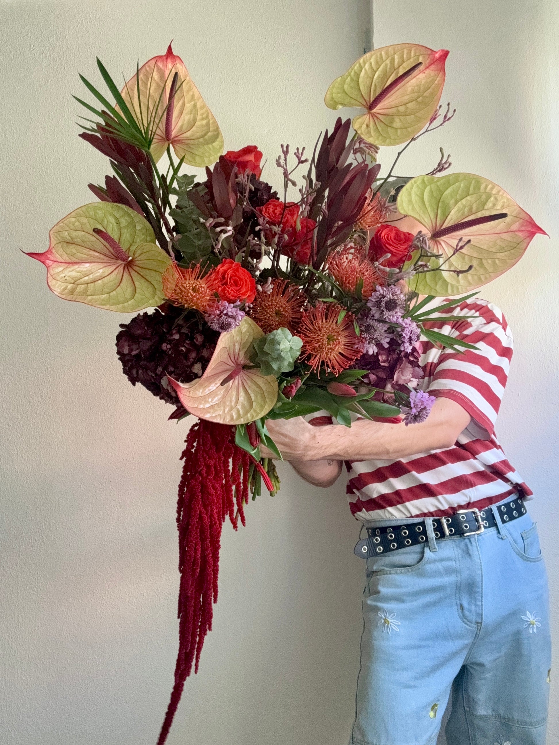 This vibrant arrangement features green anthuriums, ruby hortênsias, and red tulips. Expertly crafted with a keen eye for color and balance, this blend brings a touch of nature's beauty to your space.